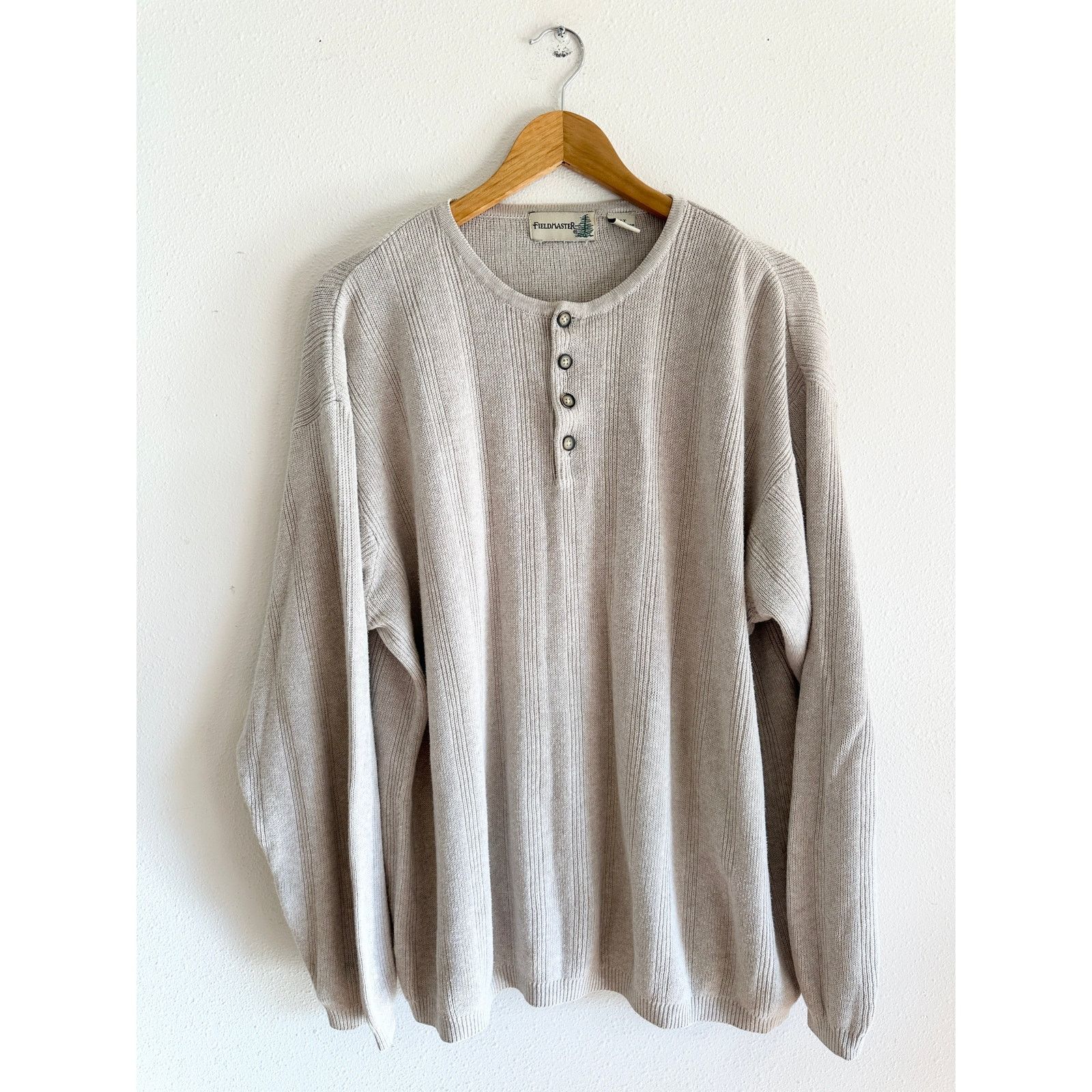 Great quality, cozy sweater with a fun button neckline and striped knit pattern. This is 100% cotton but a lighter weight knit and super comfy.